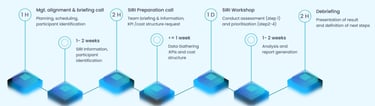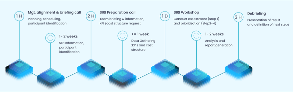 We conduct a SIRI assessment over a period of around six weeks, including preparation and data-gathering. The basic assessment requires a total of two days in-company, including line walk, 1:1 interviews and group review.